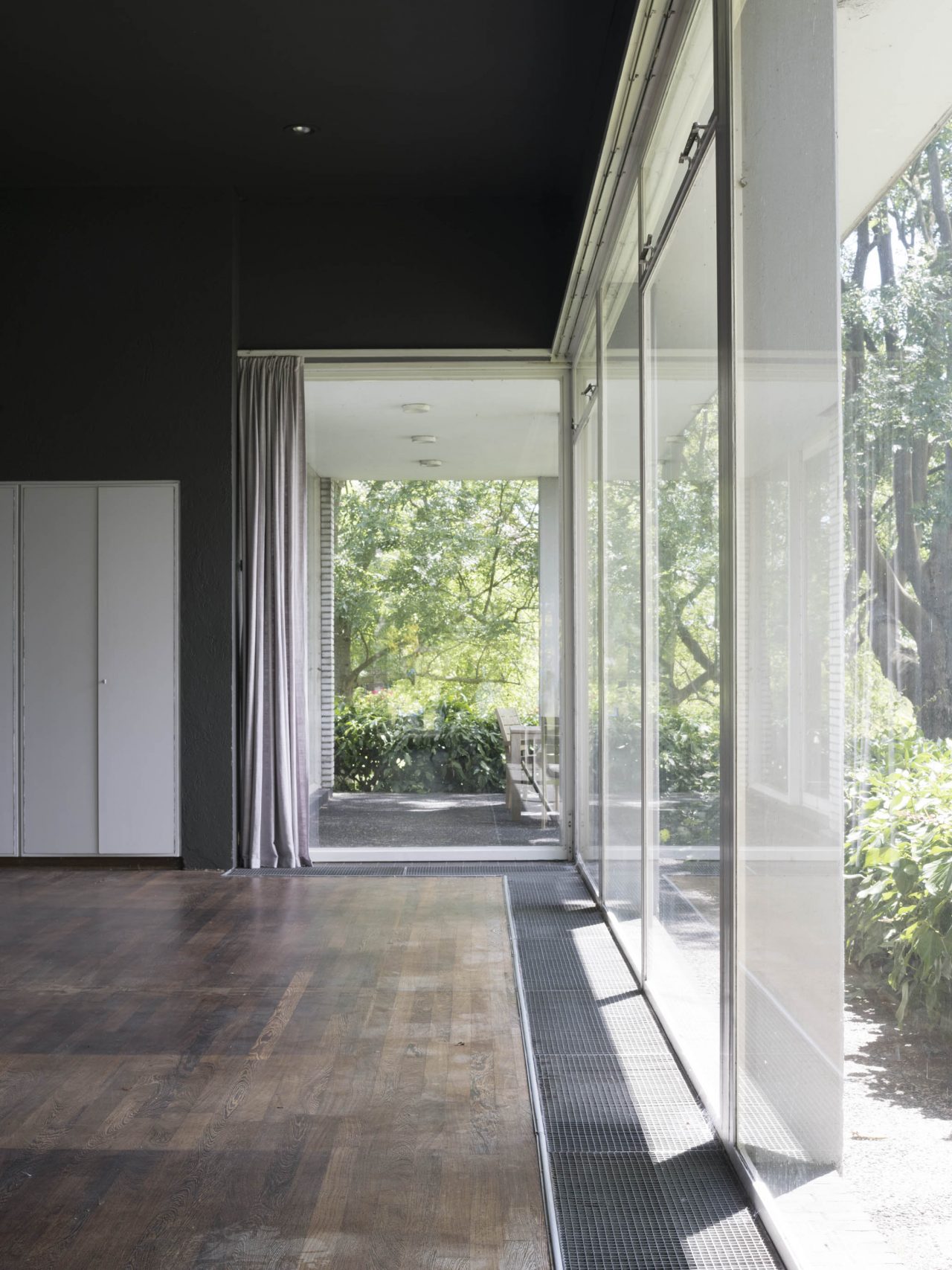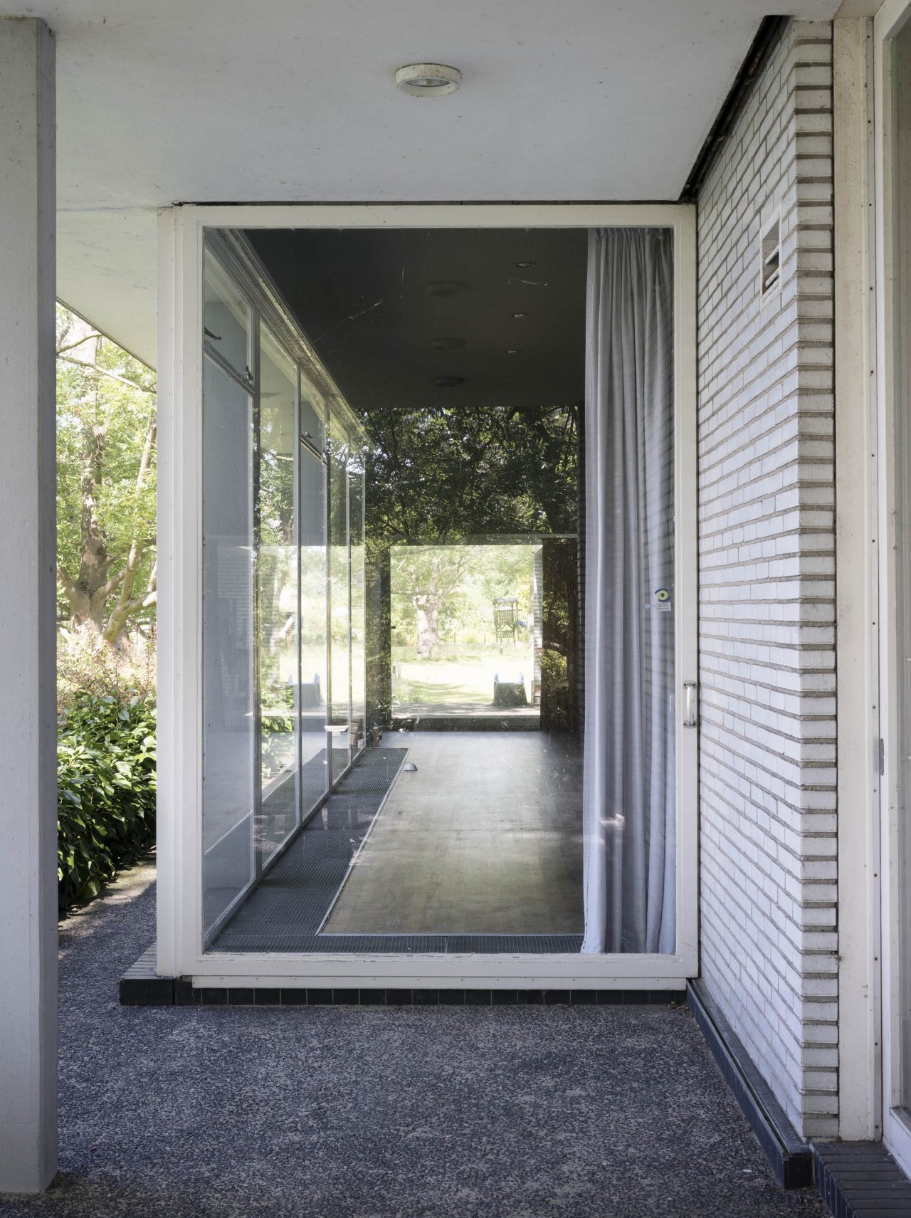 Rietveld ontwierp grote ramen voor zijn huizen, maar zelden besloegen ze in zijn vooroorlogse ontwerpen de hele gevel van grond tot plafond. Toen hij na de oorlog bungalows begon te ontwerpen gebruikte hij grotere vensters, die soms complete muren of gangen bedekten. Overal in zijn werk gebruikte hij glazen deuren om toegang te geven tot terrassen of balkons. Voor huis Van den Doel in Ilpendam (1959) ontwierp hij een speciale glazen terrasdeur die met behulp van rails volledig uit het kozijn kon schuiven. Volledig geopend staat de deur parallel aan de buitenmuur. Door de deur op deze manier te ontwerpen, liep de binnenvloer naadloos door op de terrasvloer buiten, waardoor de buitenruimte naar de binnenruimte werd getrokken en vice versa. Rietveld was niet de enige architect die experimenteerde met deze constructie. In 1932 bijvoorbeeld ontwierpen architecten Ben Merkelbach en Charles Karsten voor zomerhuis Dijkstra in Groet twee grote glazen terrasdeuren met meerdere panelen die volledig uit hun kozijnen konden schuiven en zo de twee gevels in de zuidhoek volledig openden.[6]