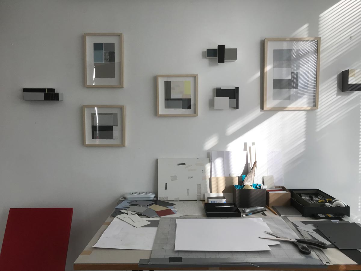 In de ruim vier weken dat ik in PE5 heb gewerkt zijn er tien collages ontstaan. Tijdens het ontwerpen ervan heb ik mij gericht op een zo eenvoudig mogelijke vormgeving door gebruik te maken van geometrisch abstracte vormen en een minimum aan kleuren. Door de plaatsing in asymmetrische composities, waarbij de vormen vaak haaks als molenwieken gepositioneerd zijn, heb ik geprobeerd om een helder evenwicht van begrenzing en openheid te realiseren. Dit om recht te doen aan de door ‘ruimtekunstenaar’ Gerrit Rietveld gehanteerde ontwerpprincipes licht, ruimte en soberheid.