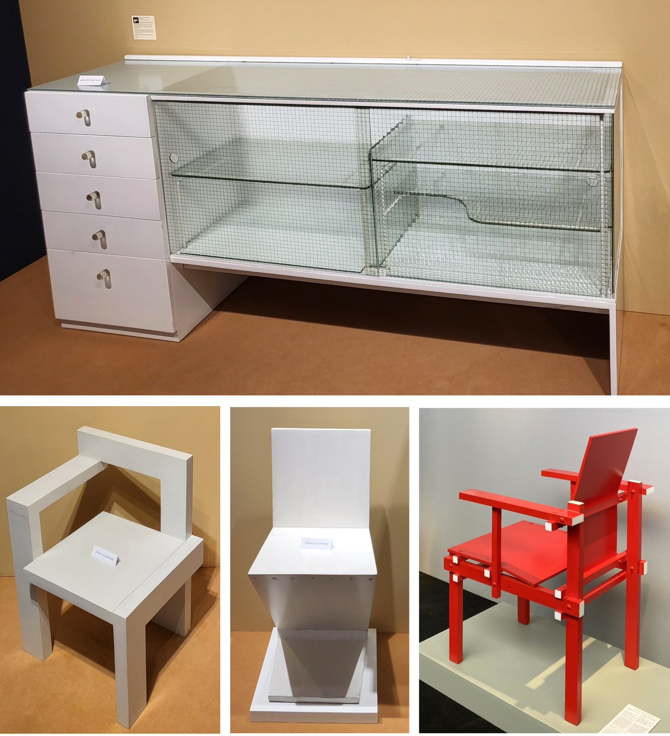 Gezien op de PAN: Dressoir R54 en v.l.n.r. Steltmanstoel, Zigzagstoel en Rode armstoel met witte accenten.