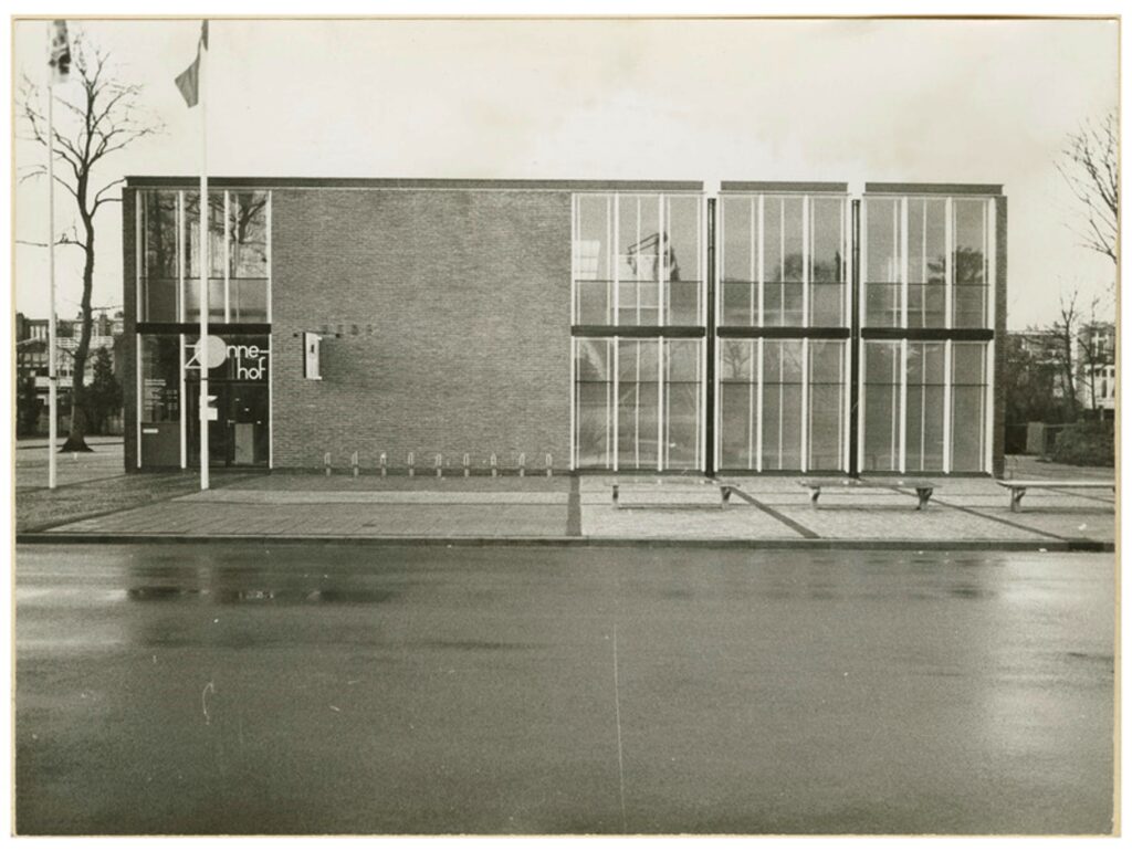 Tot slot nog iets over de naam. Molendijk wilde, zo gaat het verhaal, graag een naam als De Fakkel of De Vlam, zoals dat in socialistische kringen gebruikelijk was. Rietveld was voorstander van De Zonnehof, naar de villa die op het terrein had gestaan. De avond voor de opening tekende hij dit ontwerp en liet het de volgende dag aanbrengen boven de entree.
