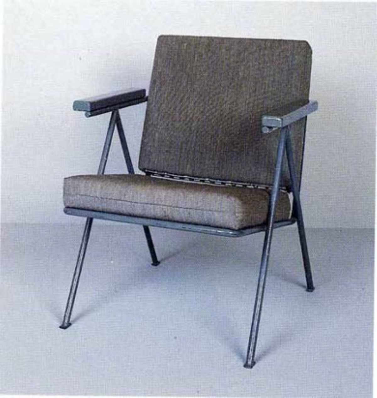 Op de tentoonstelling presenteerde hij ook een nieuwe stoel, om die reden de Amersfoortse stoel wordt genoemd. De tentoonstelling werd gehouden in het Stedelijk Gymnasium Johan van Oldenbarneveld, een gebouw uit 1933 ontworpen door de Amersfoortse architect C.B. van der Tak. Hoewel Rietveld het gebouw uitbundig prees in een artikel over dit project, lijkt me dit meer een vorm van tentoonstellingspromotie dan van oprechte waardering. Burgemeester Molendijk dacht  er in ieder geval heel anders over en sloeg een heel andere toon aan in de brief die hij in 1958 aan de gemeenteraad stuurde. Daarin staat dat ‘Wat het onderbrengen van tentoonstellingen van enig formaat betreft, kan in Amersfoort worden gesproken van een noodtoestand.’ De aanstaande herdenking,  in de zomer van 1959, van het feit dat Amersfoort 700 jaar geleden stadsrechten kreeg met o.a. een grote tentoonstelling maakt het verantwoord ‘thans te besluiten tot de bouw van een permanent tentoonstellingspaviljoen’, aldus Molendijk.