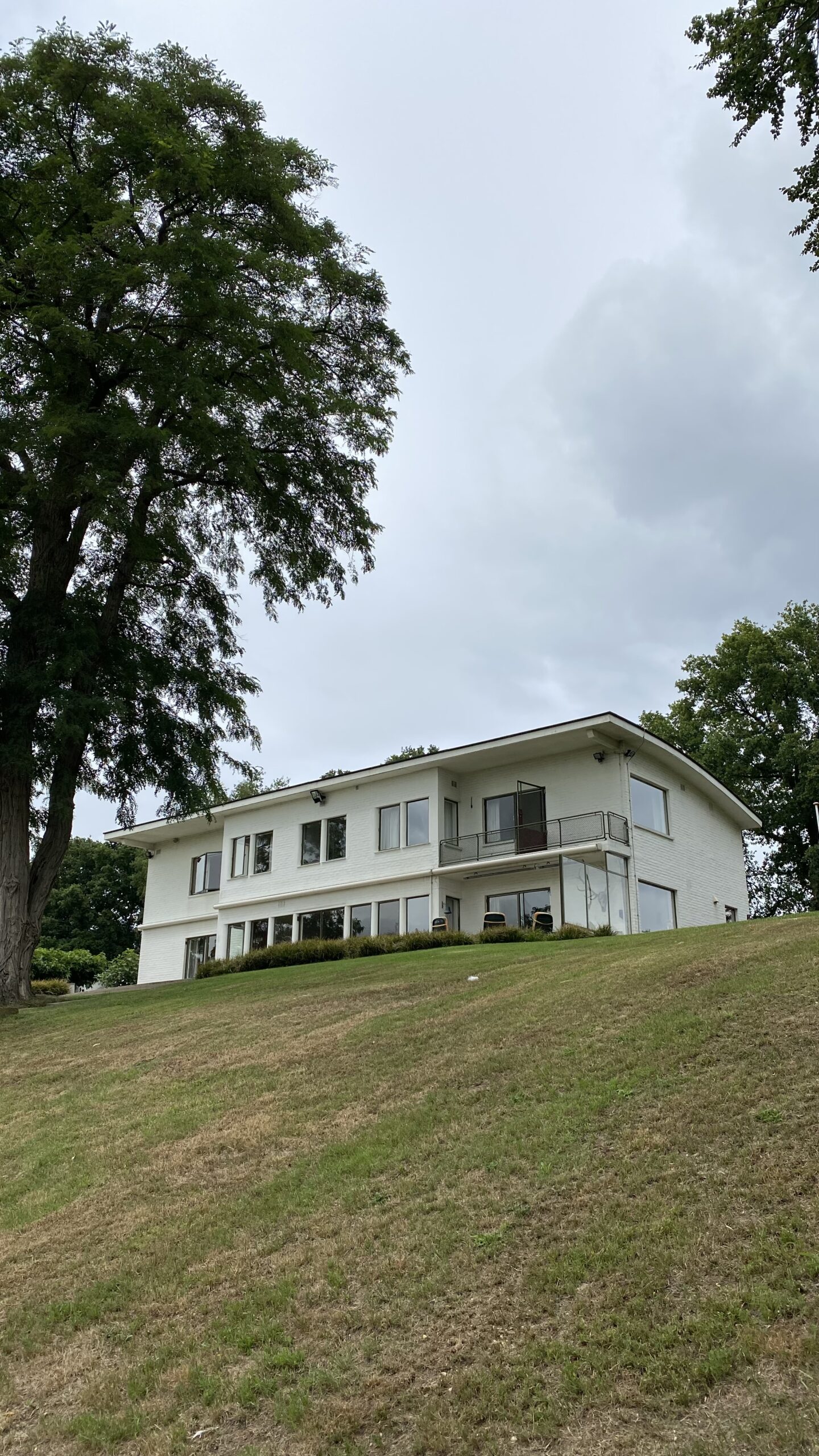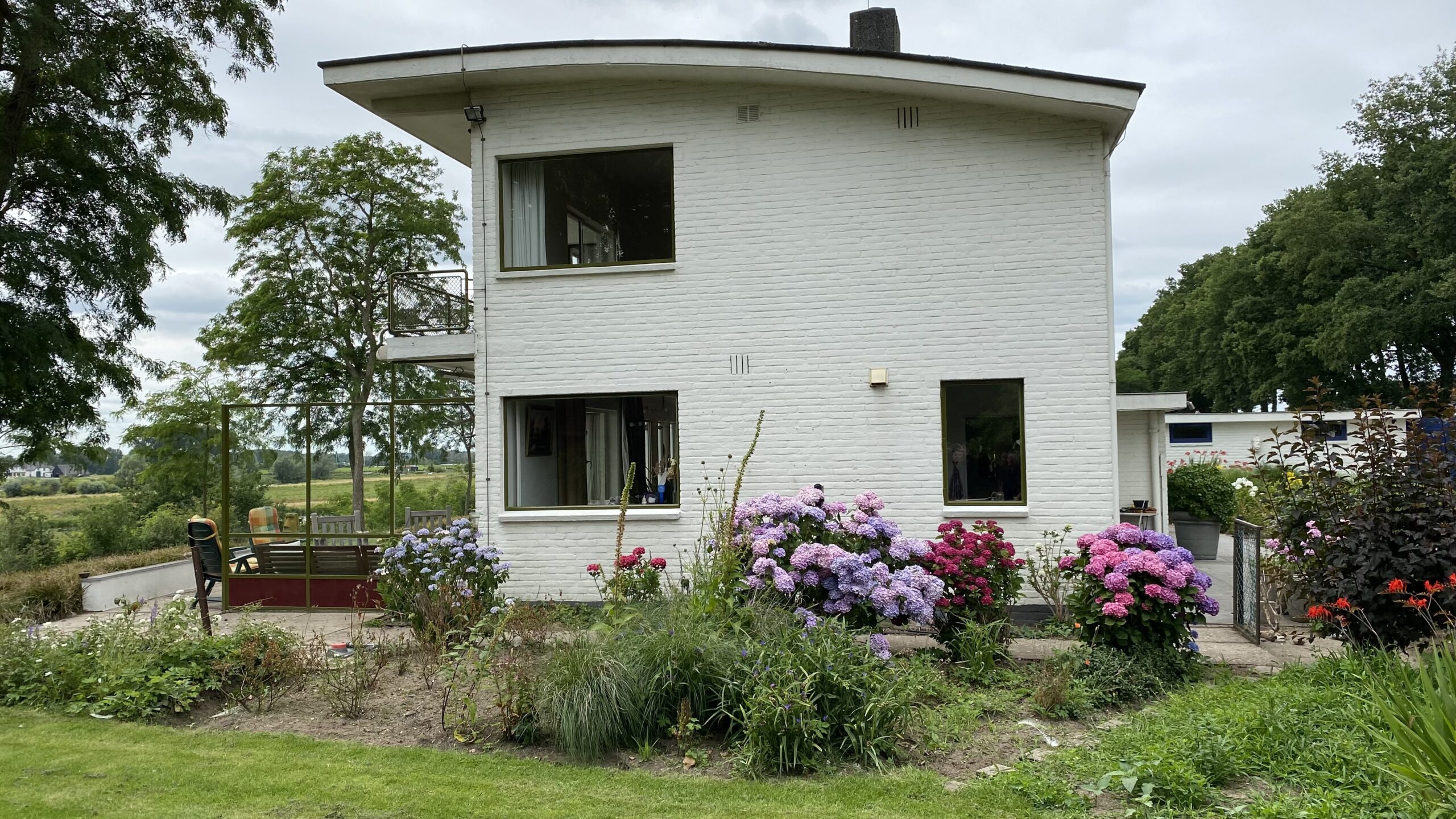 We krijgen een uitgebreide rondleiding. We beginnen met een rondje om het huis, gevolgd door een wandeling door de tuin. Het huis staat op 5.000 m2 eigen grond, de overige 12.000 m2 is in erfpacht. We lopen door de boomgaard, langs de oude stuw en het ezelstalletje met rieten dak. Van de mooie doorkijkjes die we op foto’s proberen te vangen bestaan ook door Rietveld gemaakte aquarellen.
