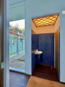 Twee van de bijgebouwen zijn samengevoegd en opnieuw ingericht, waardoor er een ruimte is ontstaan voor exposities, presentaties, uitvoeringen en culturele activiteiten. In deze ruimte gaven Martin en Annette ons een presentatie over het restauratieproces, waarna een gezamenlijke rondleiding door de woning volgde, waarbij we in een ongedwongen sfeer uitgebreid uitleg kregen.