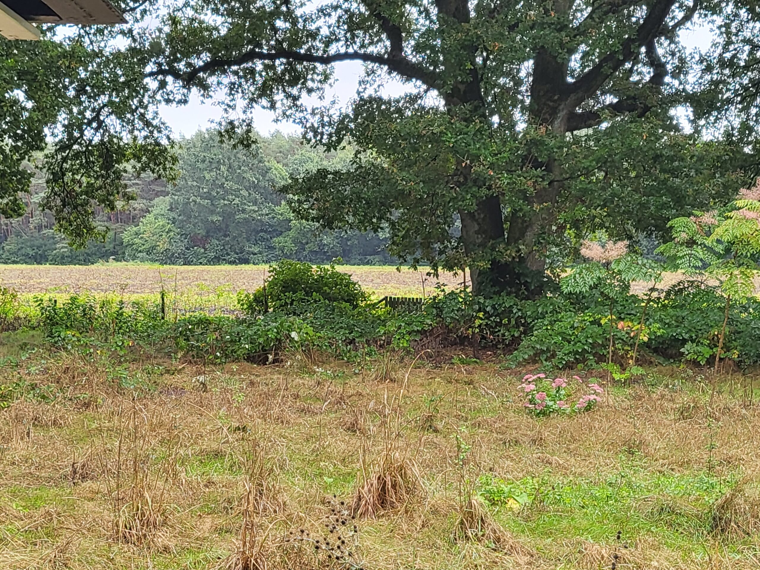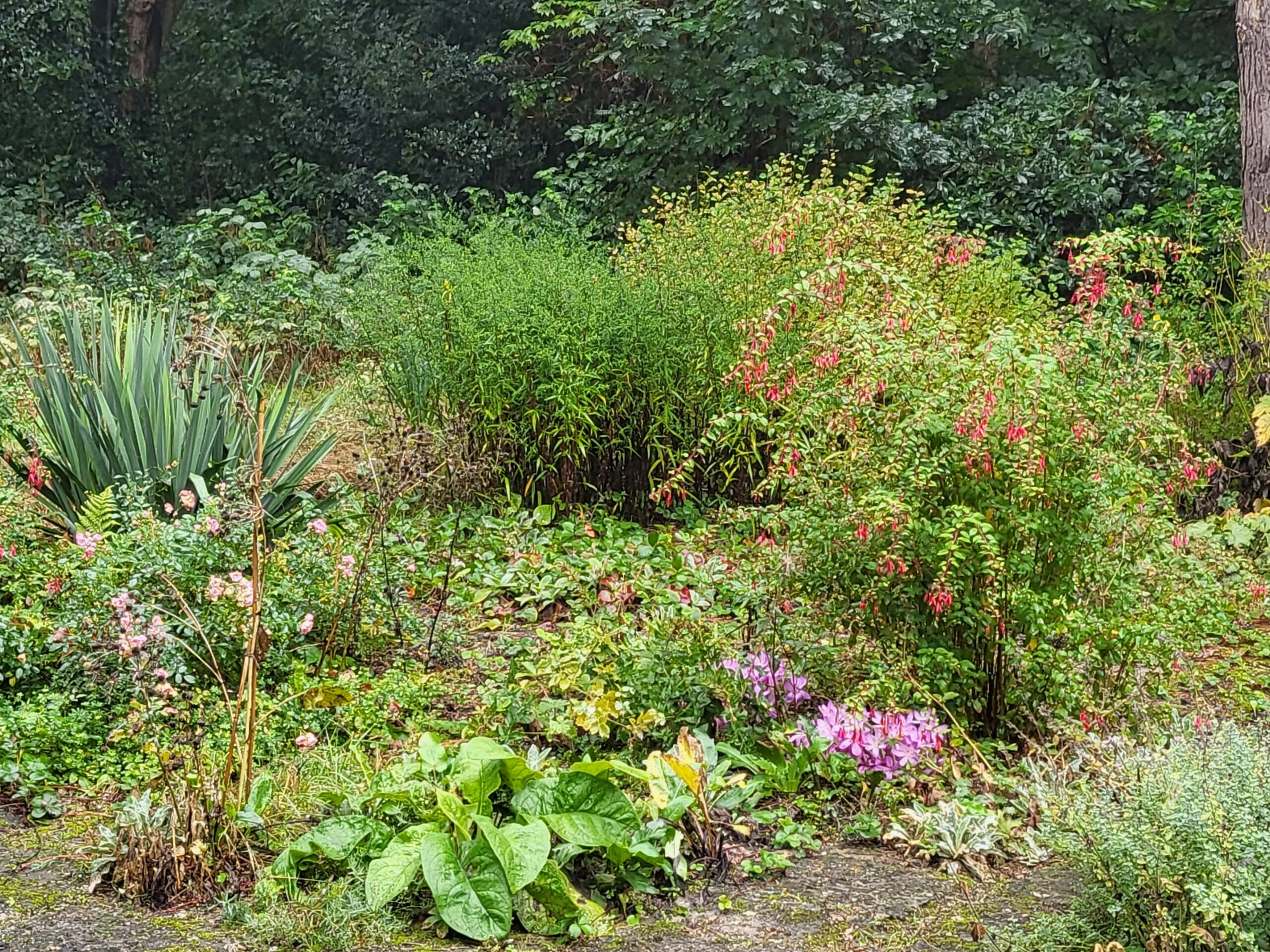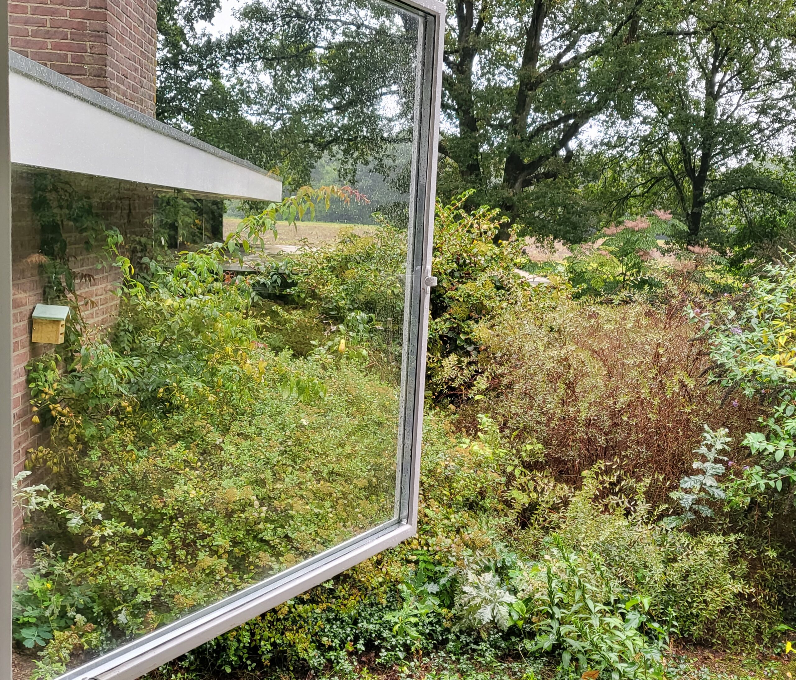 We besluiten ons bezoek met een rondje om het huis – helaas in de regen. Van de door Mien Ruys ontworpen tuin en park zijn alleen enkele bloemperken in de oorspronkelijke staat behouden gebleven. De rest is grotendeels dichtgegroeid met bos. In het veld voor het huis is het oorspronkelijke bosgras (officieel Bochtige Smele) bijna helemaal overwoekerd geraakt door andere, blijkbaar robuustere, grassoorten. Diederik is nu aan het experimenteren met de aanplant van nieuwe perkjes om het oude bosgras terug te krijgen.