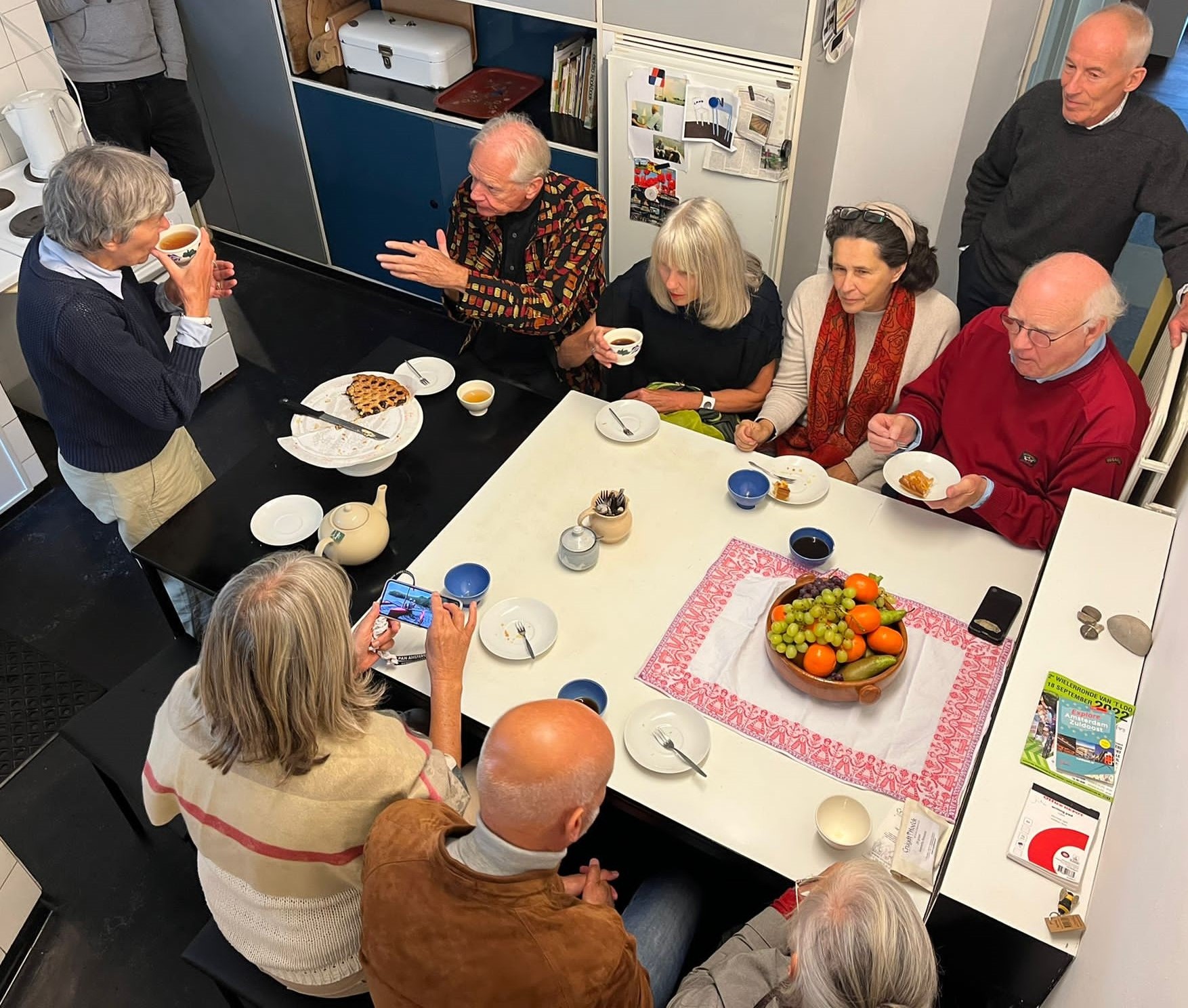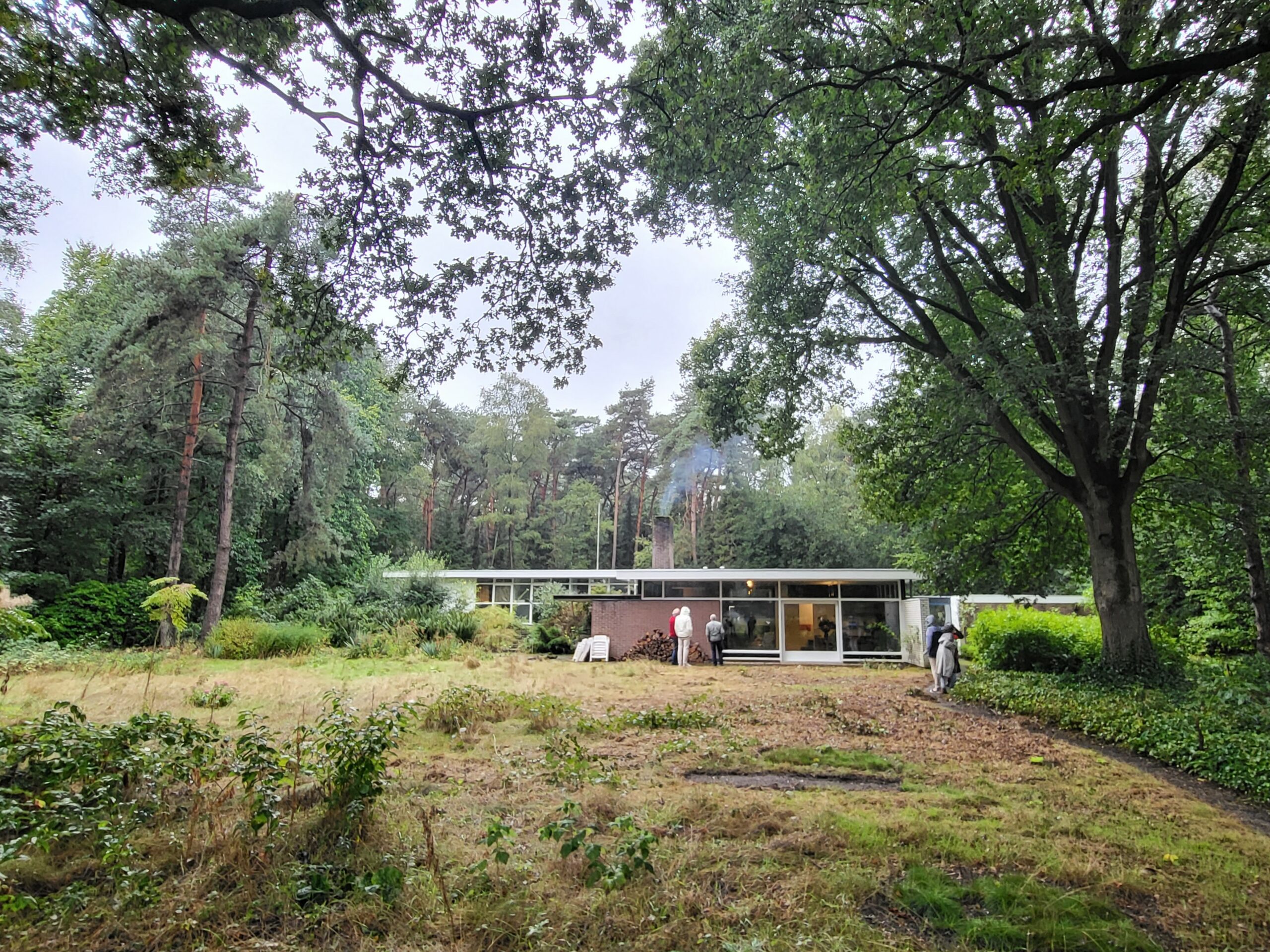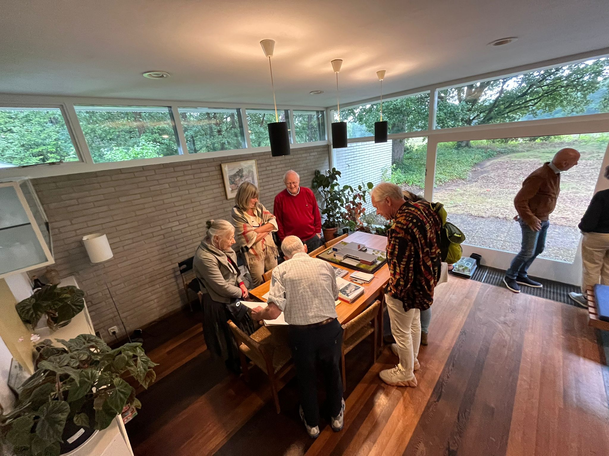 Na een lange rit vanuit huis Smedes in Huis ter Heide denken we dat onze route-begeleidster het mis heeft als ze aan het begin van Bergeijk zegt dat we linksaf moeten slaan naar de Fazantlaan, maar na een rondje door het dorpscentrum blijkt ze het toch bij het rechte eind te hebben en arriveren mijn echtgenoot Loek en ik (Joke) aan het eind van een bosweggetje bij huis Van Daalen. Daar worden we naar goed Brabants gebruik in de keuken ontvangen met koffie en vlaai en worstenbroodjes. Er wordt een plekje voor ons vrijgemaakt op de metalen bankjes (van Martin Visser) aan een witte Rietveldkeukentafel met zwart uitschuifblad door de andere vijf bezoekers: Adrien en Heleen (huis Smedes, Bennekom), Ans en Arie (huis Smit, Kinderdijk) en Martine (kleindochter Rietveld). Zo ervaren we meteen hoe het voelde voor het gezin Van Daalen toen zij er in de late jaren vijftig en in de jaren zestig hun keukentafelgesprekken voerden.
