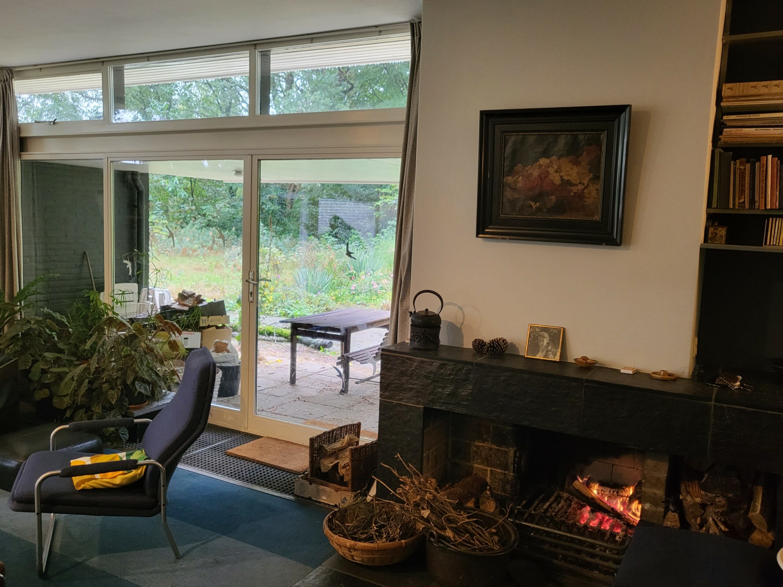 De grote raampartij in de woon/eetkamer met open haard, doorgeefkast naar de keuken en meubels van Martin Visser legt een directe verbinding van binnen met buiten.