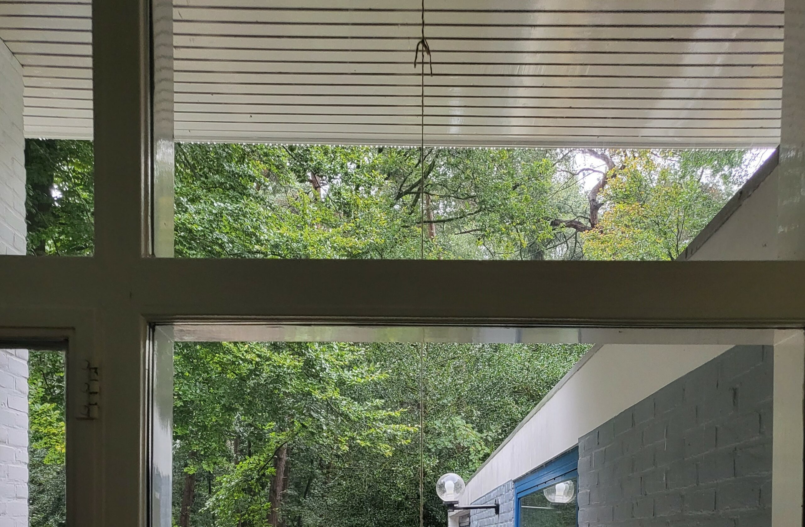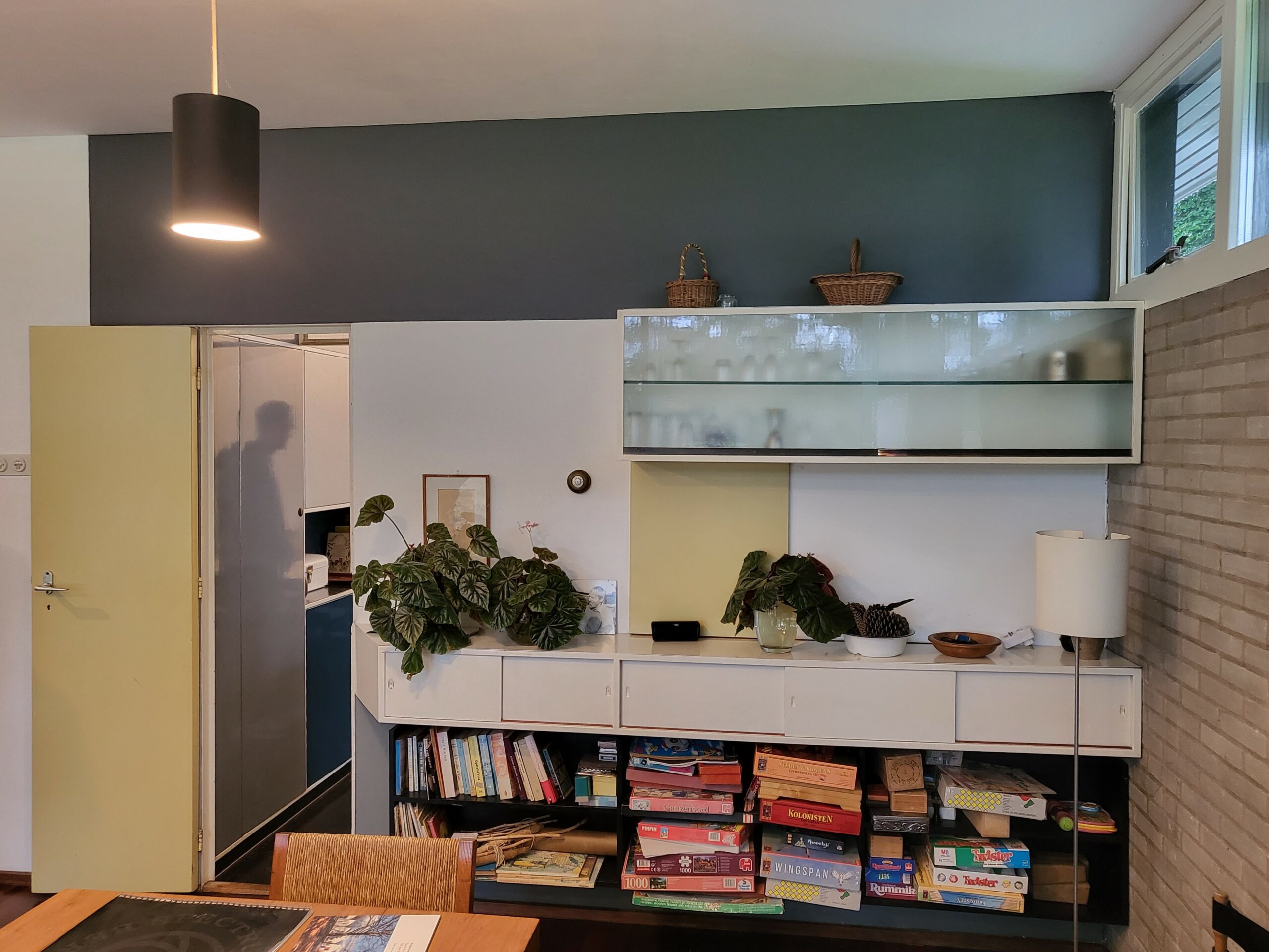 We begrijpen meteen waarom opdrachtgever Roelof van Daalen – na raadpleging van Rietveld – geluidsisolerende plafondtegels in de keuken en op andere plekken in het huis aan heeft laten brengen. Jantien verzucht dat die in de loop der jaren erg bruin geworden waren, maar  nu gelukkig weer wit geschilderd zijn. De energierekening is natuurlijk een van de eerste onderwerpen die ter tafel komen. Volgens Diederik valt het nog wel mee. De familie heeft eerder overal dubbele beglazing aangebracht en het dak geïsoleerd. En de zonnepalen zijn geïnstalleerd op het dak van een naburige sporthal, waar zij via een buurtcollectief bij aangesloten zijn.