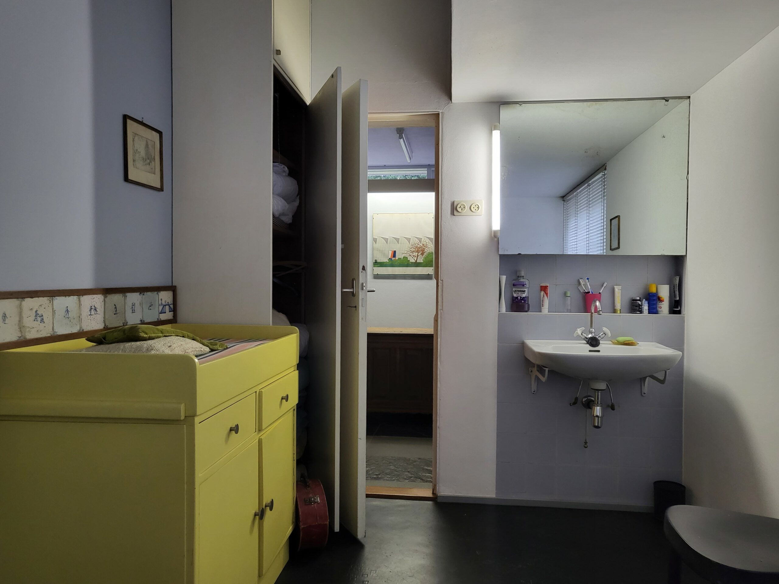 Via een trapje belanden we vervolgens in de kinderspeelkamer en in de slaapvleugel met vier kinderslaapkamers en een ouderslaapkamer. Ook daar weet Diederik iets bijzonders over te vertellen. Van de drie bungalows met slaapvleugel, die Rietveld gebouwd heeft (Bláha, Visser en Van Daalen), waren zij de enige opdrachtgevers die er bij Rietveld door kregen dat in de lange gang langs de slaapkamers een glaswand met balustrade mocht komen in plaats van een volledige glaswand.