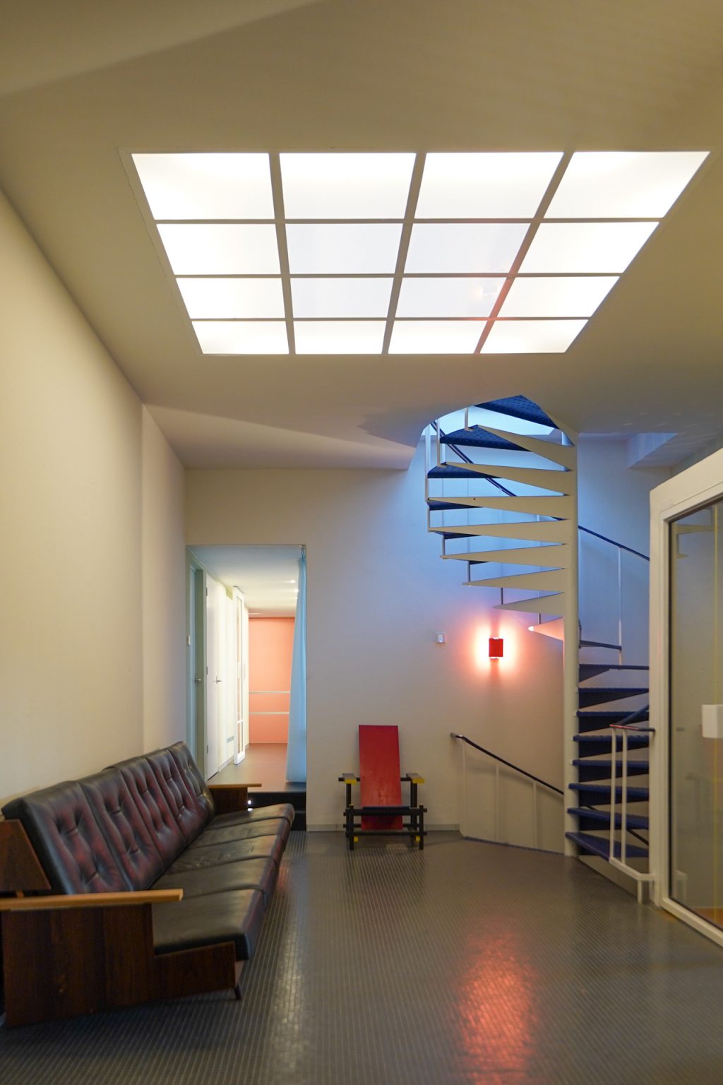 Bij het betreden van de woning door een opvallende betonnen vierkante tunnel/portiek kom je direct in een lichte hal met een grijze mozaïekvloer en met een prachtig in het plafond opgenomen vierkant bovenlicht bestaande uit 16 gelijkzijdige vierkanten van matglas. Het bovenlicht is een kunstwerk op zich en ’s avonds kan dit ook prachtig verlicht worden. Ook een nis in de hal naar het toilet bevat een mooi bovenlicht. Een mooie stalen wenteltrap (naar souterrain en dak) siert een hoek van de hal. Het hele huis is heerlijk licht, de verhoudingen van de grote ramen, wanden en de vele ingebouwde kasten, zijn harmonisch en mooi; een kenmerk van alle Rietveldhuizen.