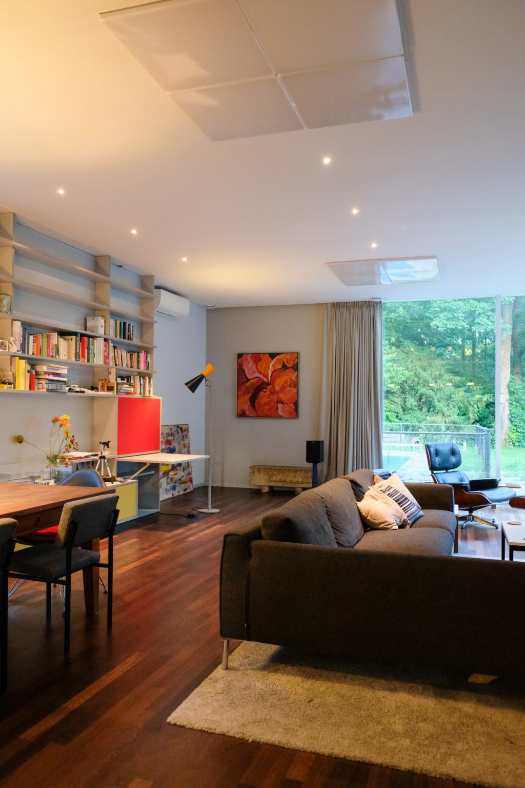 In de woonkamer is ook een vergelijkbaar mooi bovenlicht aangebracht als in de hal. Een groot raam dat van vloer tot plafond loopt, kan geheel weggeschoven worden achter de boekenkast. Deze kast is in het interieur geïntegreerd en naar het origineel opnieuw vervaardigd.