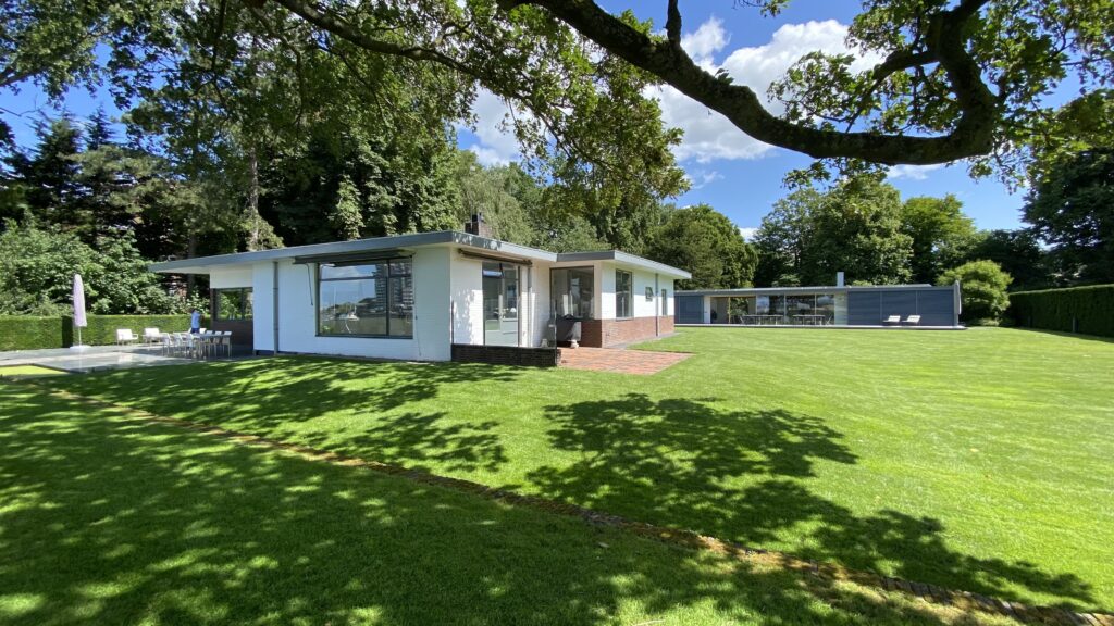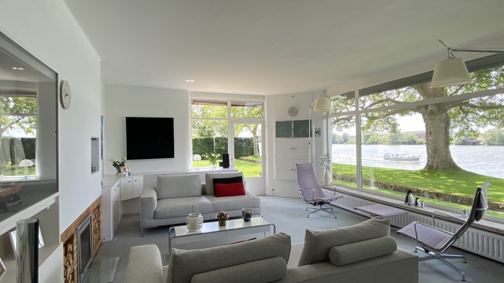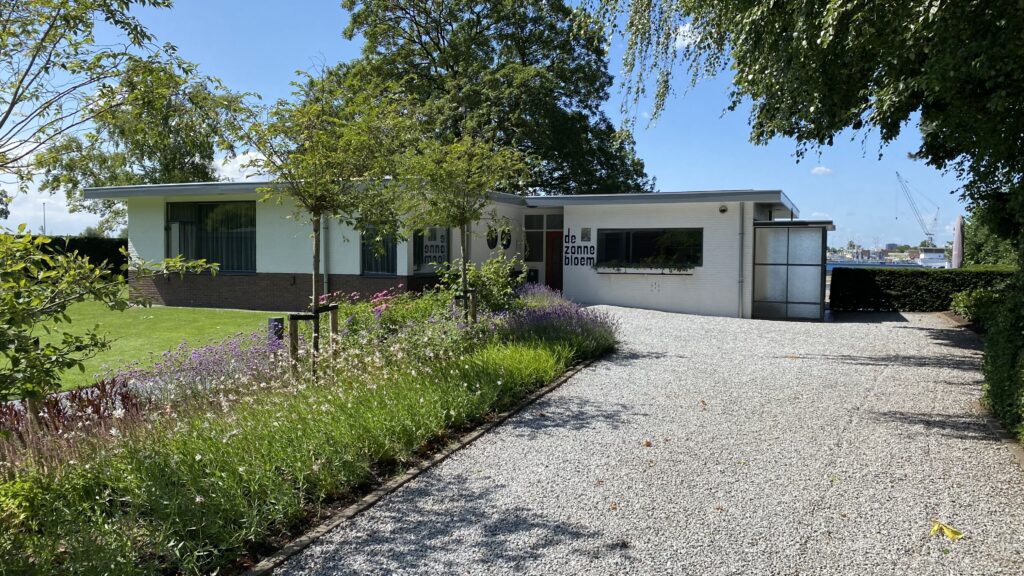 Ans en Arie ontvangen ons niet in het huis, daar zou te weinig ruimte zijn zelfs nadat de belangstellenden in twee shifts waren verdeeld, maar in het ‘tuinhuis’ dat zeven jaar geleden aan het begin van het perceel is neergezet. Met twee ruime garages aan weerszijden en een middenstuk met keukenblok, zitgedeelte en een royaal terras over de hele lengte is het een ideale plek om gasten te ontvangen en het verhaal te vertellen over hun ervaringen met het huis en de eerste bewoners en opdrachtgevers Leo Smit en zijn eerste vrouw Jo. Smit, scheepsbouwer van beroep, heeft eind 1945 contact gezocht met Rietveld. Hij wilde op het terrein van zijn scheepswerf een kleiner, modern huis laten bouwen. Smit bemoeide zich intensief met het ontwerp, niet alleen met de locatie, maar vooral met de technische kanten, hij was tenslotte scheepsbouwer. Het eerste ontwerp werd afgekeurd door de schoonheidscommissie, daarvoor in de plaats kwam een veel kleiner huis: een bungalow, met een plattegrond van twee in elkaar geschoven haaks op elkaar staande rechthoeken. Kort na de Tweede Wereldoorlog was er een groot gebrek aan bouwmaterialen en golden daarom beperkingen voor het toegestane bouwvolume. Dit werd gecompenseerd door onder het huis een grote kelder aan te brengen die tevens de oplossing was voor het bouwen in de ter plekke zeer drassige grond. Smit schreef aan Rietveld: ‘Wij zouden als scheepsbouwers kunnen zeggen, dat wij het huis laten drijven op zijn kelders.’