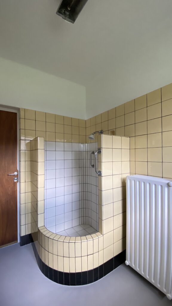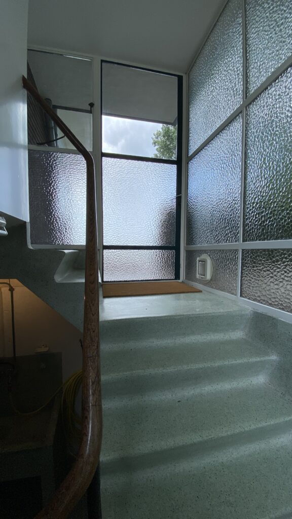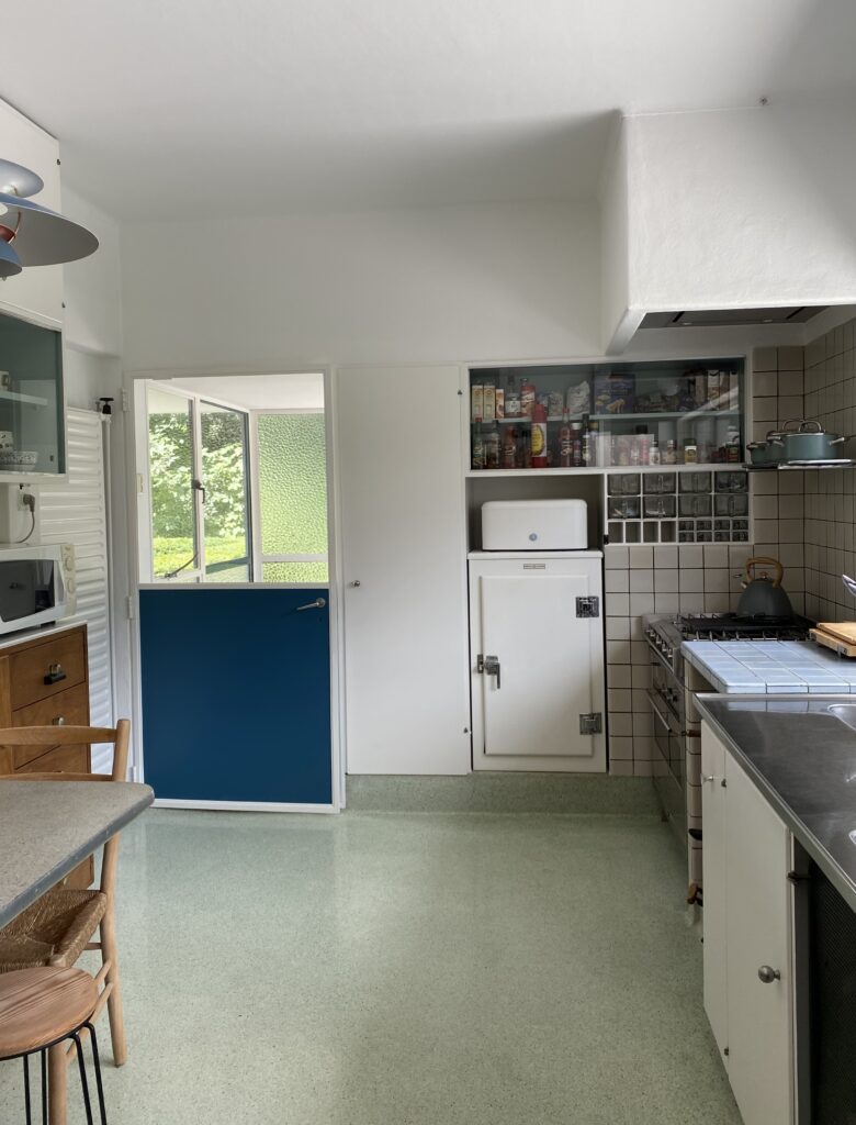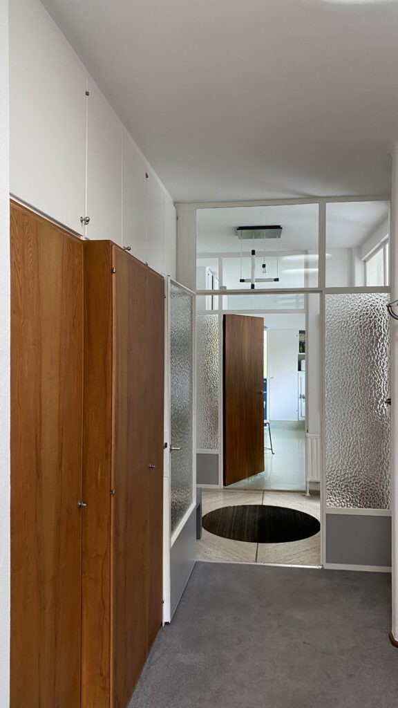 Een halve eeuw na dato blijkt deze kelder cruciaal voor het behouden van het oorspronkelijke  interieur en tegelijkertijd naar de huidige maatstaven zeer comfortabel te kunnen wonen. Arie en Ans hebben er een wellnessruimte met alle gemakken van televisie, sauna, ligbanken etc. laten bouwen, en er is  nog ruimte voor meer aanpassingen of toevoegingen. Daardoor konden boven de originele keuken en badkamer gehandhaafd blijven. Ook allerlei details door Rietveld of Leo Smit bedacht konden we met eigen ogen bewonderen: het doorgeefluik van de keuken naar de eetkamer is een typisch Rietveld trekje, de twee ronde ramen naast de voordeur die eruitzien als twee patrijspoorten heeft hij ook bedacht, de smalle gang met ronde hoeken heeft iets van het interieur van een schip en is misschien voortgesproten uit de wens van Leo Smit. Zo zijn er allerlei verrassingen waar wij tijdens de rondleiding niet op uit gekeken raakten.