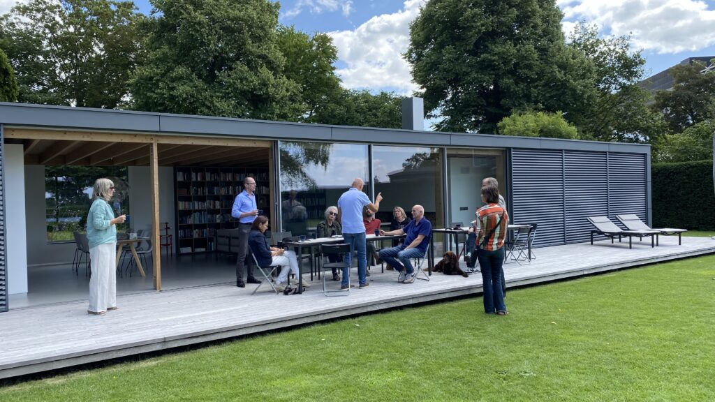 Toch moesten we plaats maken voor de volgende groep. Op zich geen echte straf want op het terras van het tuinhuis konden we uitgebreid napraten voorzien van heerlijke drankjes en hapjes. Ik heb gehoord dat het nadat ook de tweede groep het huis bekeken had nog heel gezellig is geworden op deze warme en zonnige julidag, maar moest zelf jammer genoeg rond een uur of drie weer naar huis. Veel dank aan de gastheer en gastvrouw Arie en Ans Koedood voor deze geweldige ontvangst. Wie niet aanwezig kon zijn, kan zich troosten met dit verslag, inclusief de mooie foto’s van Erik Hesmerg of de uitgebreide tekst over huis Smit met bijbehorende foto’s in het boek van Arjan Bronkhorst, Weelde van de Eenvoud, Amsterdam 2018.