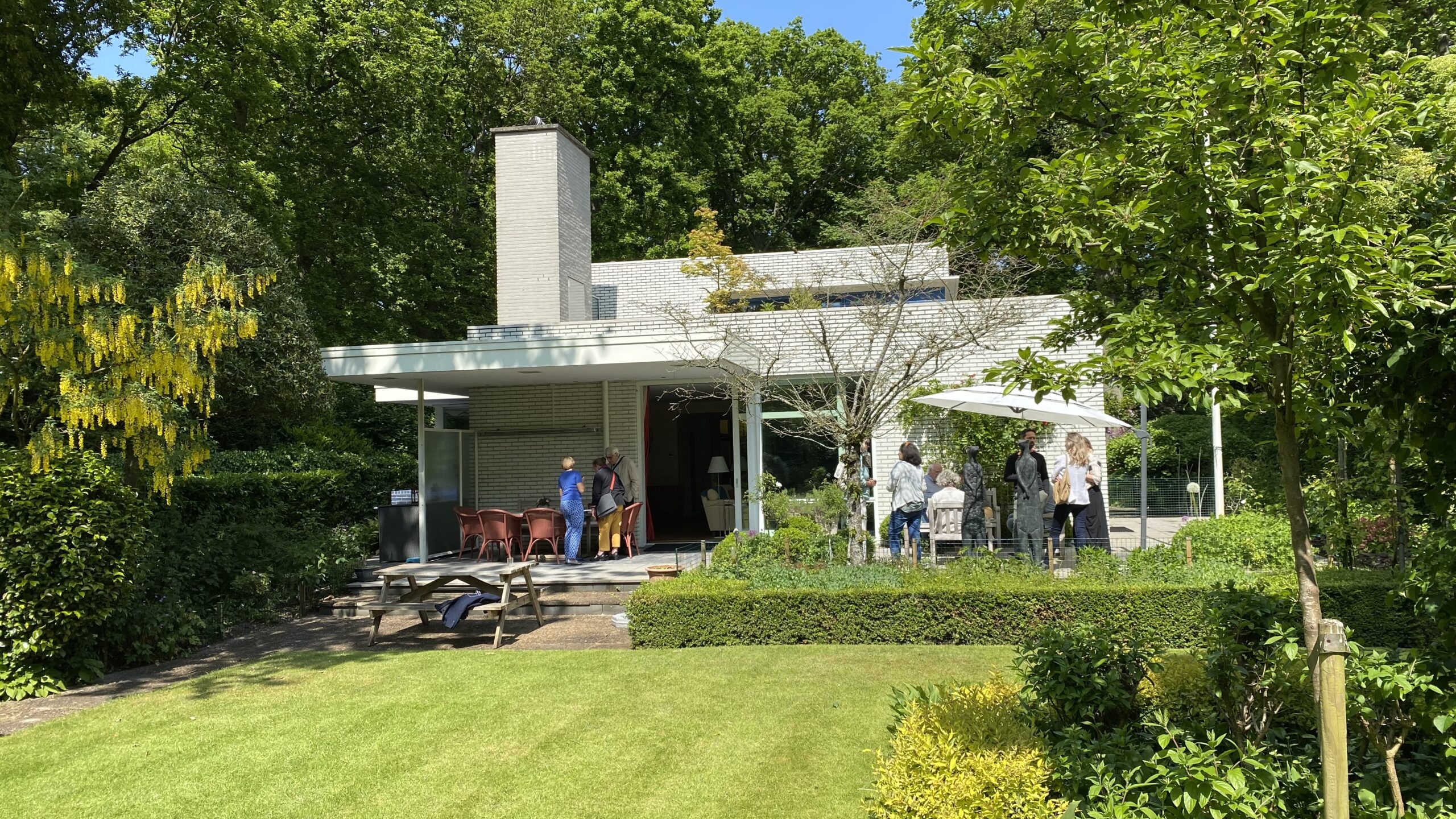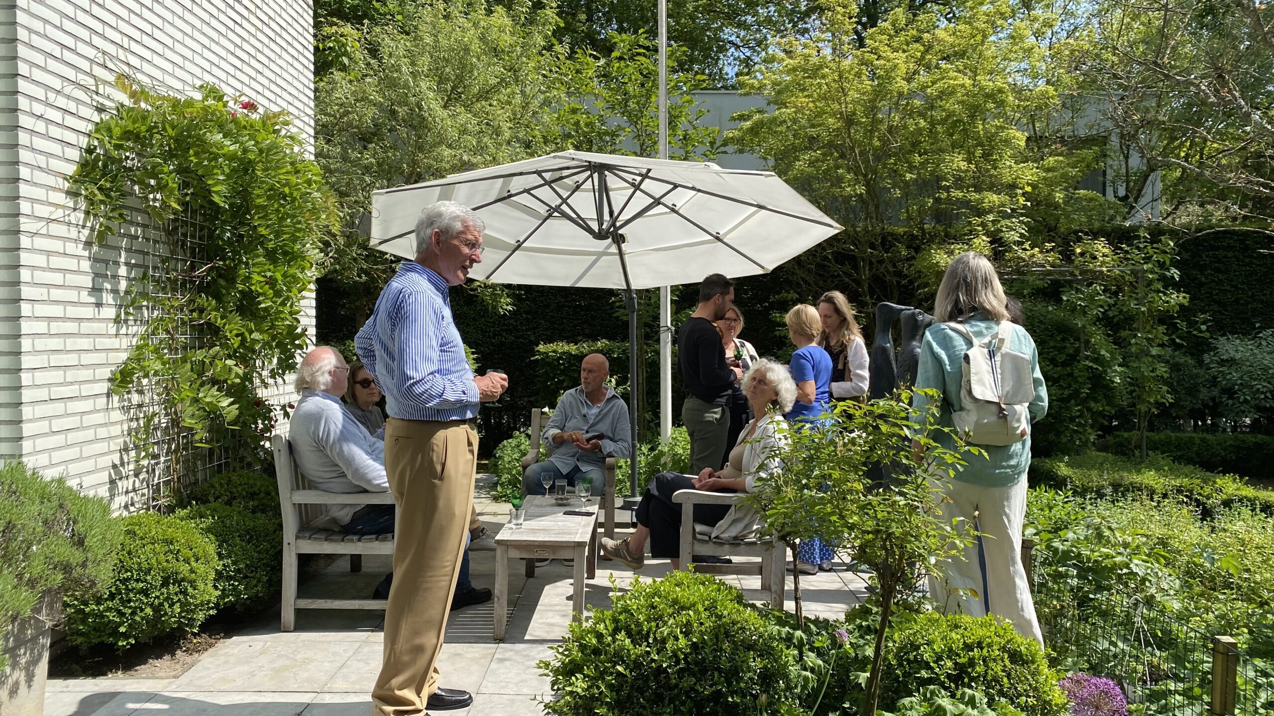 Op zaterdag 27 mei waren wij met onze vereniging te gast bij de familie Van der Graaf in Wassenaar. Het was een zonovergoten dag en na een ritje door het prachtige Wassenaar met grote lommerrijke lanen met fraaie klassieke huizen met grote tuinen kwamen wij aan bij huis Erdman. Wat direct opviel was dat het prachtige moderne Rietveldhuis op het achterste gedeelte van het perceel staat, waardoor aan de voorzijde een mooie langgerekte tuin is met diverse op de zon gelegen terrassen. Na een hartelijke ontvangst door de familie Van der Graaf en begroeting van de andere leden vertelde mevrouw Van der Graaf dat ze er al 30 jaar met heel veel plezier woonden en er nooit meer weg wilden. Het huis is in 1960 gebouwd en zij wonen er vanaf 1993. Haar ouders waren bevriend met de familie Erdman en zodoende kwamen ze in contact toen het huis te koop kwam.