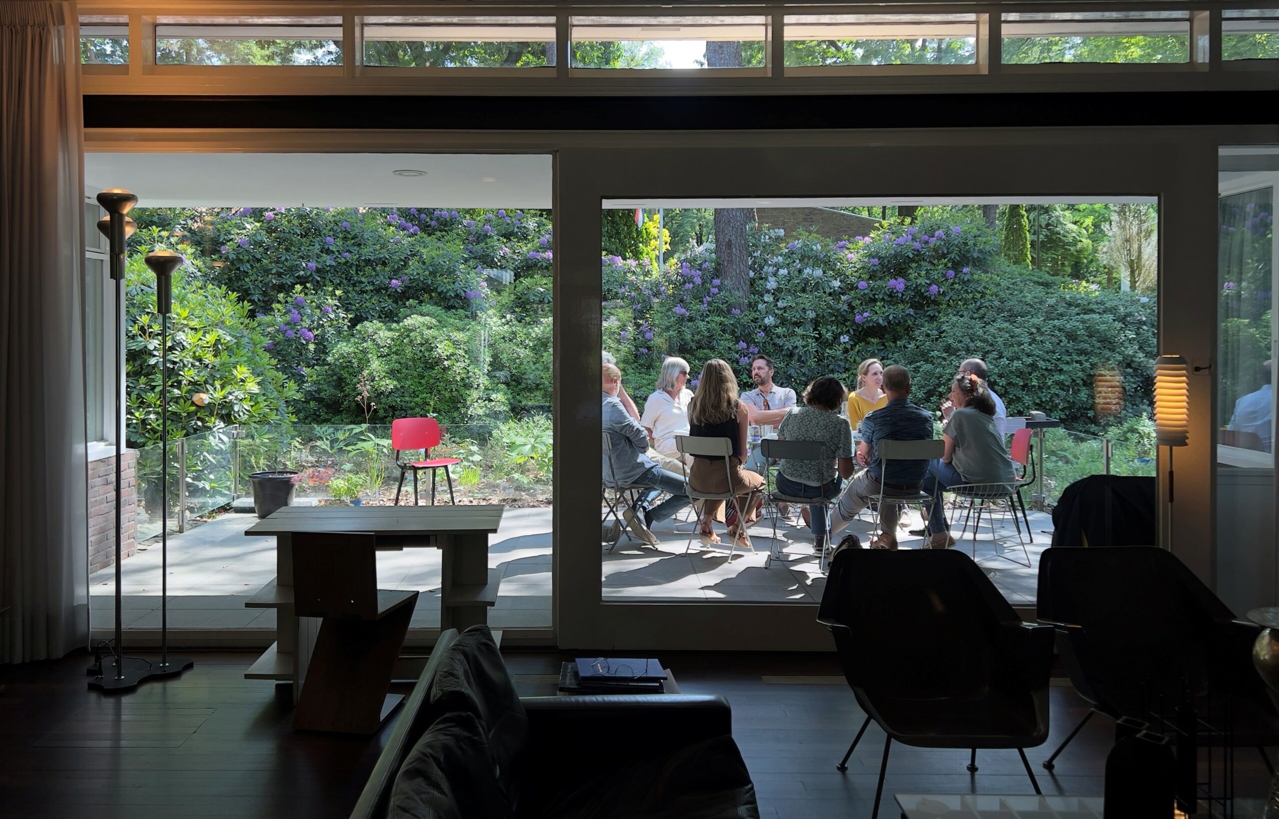 Erik kiest er voor om gefaseerd kleine groepen door het huis te nemen. Petra zorgt met flair voor de overige gasten op het zonnige terras. Een uitstekend idee! Het is op deze manier makkelijk communiceren, zowel met de heer des huizes tijdens de rondleiding als met de gastvrouw en de visite op het terras. Er is tijd genoeg voor verwondering, brandende vragen en het uitwisselen van tips.