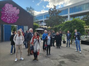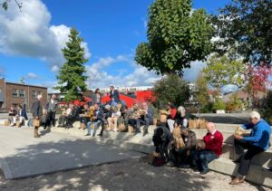 Gelukkig was het niet alleen binnen zitten geblazen. Zeker omdat we zondag 25 september boften met het weer en na een aantal dagen regen eindelijk weer konden profiteren van een zonnige dag met aangename temperaturen. Na zijn presentatie gaf Mendel Robbers een rondleiding door De Nieuwe Stad, waarbij we langs gebouwen van de voormalige Prodentfabriek liepen. Hier troffen wij nu onder andere restaurant Hoog Vuur aan en onderwijsbedrijf Salon de Nieuwe Stad van MBO Amersfoort: een kapperszaak, schoonheidssalon en nagel- en make-upstudio in één. We beëindigden de rondleiding in restaurant Het Lokaal voor het ophalen van onze duurzame lunchbox met twee rijk belegde sandwiches, een salade, een stuk fruit en een sapje. Die nuttigden we op het centrale plein van De Nieuwe Stad, op de trappen van de arena, omringd door groene beplanting. Nauwelijks voor te stellen dat hier ooit een desolate parkeerplaats lag. Schipper Bosch maakte hier geweldig statement maakte door één parkeerplek voor tien jaar te huren en er een boom op te planten. Het was het begin van een denkproces bij de gemeente dat uiteindelijk leidde tot dit geheel door Schipper Bosch vormgegeven plein inclusief parkeerplaatsen.